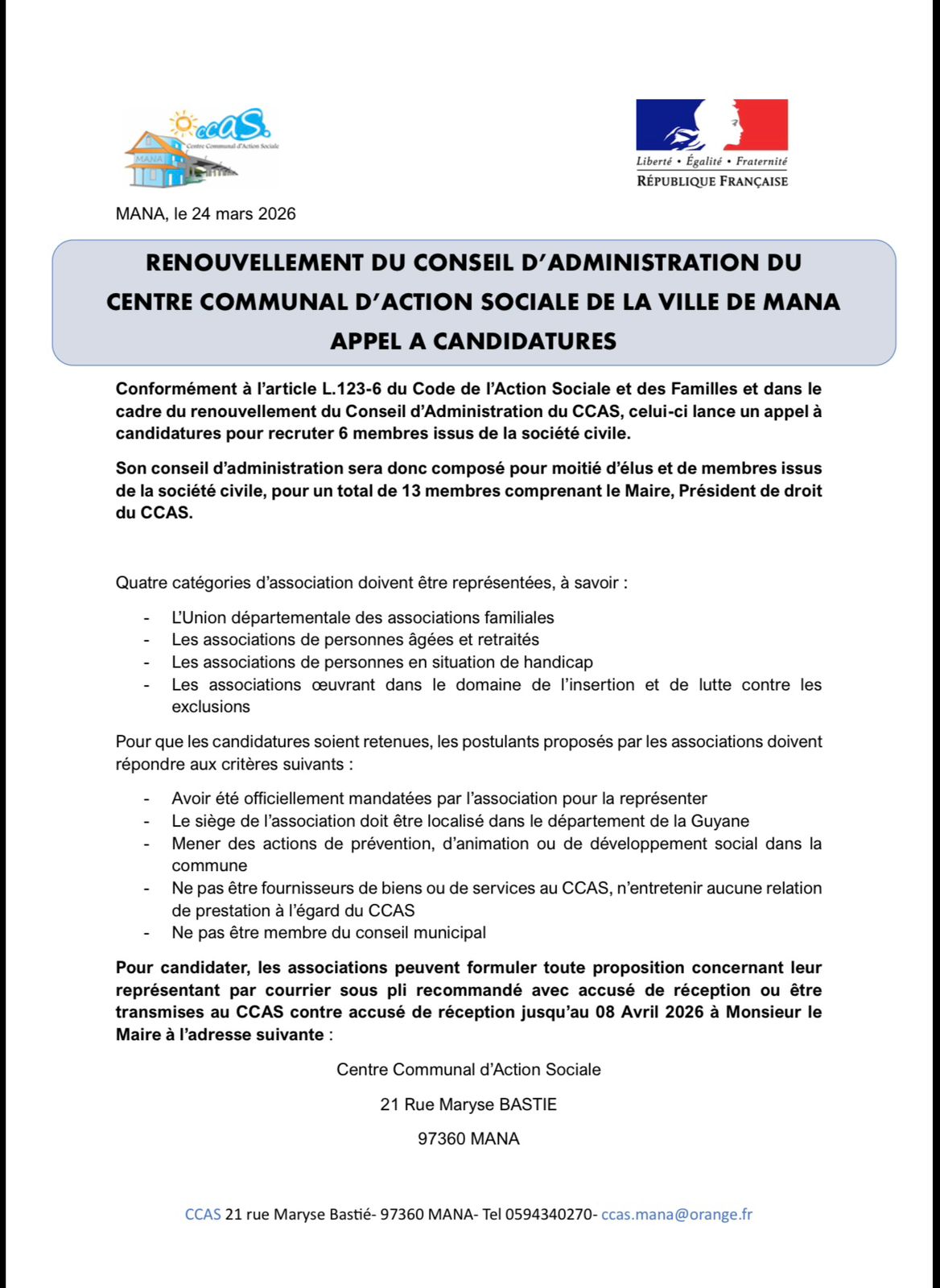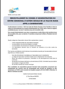 Suite aux élections municipales des 15 et 22 Mars 2026, la ville de Mana procède au renouvellement du Conseil d’Administration du Centre Communal d’Action Sociale (CCAS) et invite les associations locales agissant dans le domaine du social, de l’insertion, de la famille, des retraités ou du handicap à proposer des représentants pour siéger au sein de cette instance avant le 8 Avril 2026.
