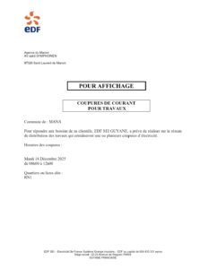 Annonce de coupure EDF sur la Ville de Mana pour travaux, le mardi 16 décembre 2025 de 8h00 à 12h00.
