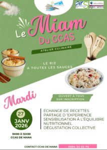 Le CCAS de la Ville de Mana organise un atelier culinaire, le mardi 27 janvier 2026 de 9h00 à 12h30.