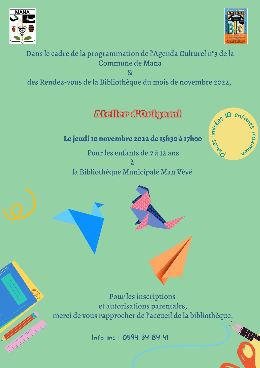 Dans le cadre de la programmation de l’Agenda Culturel N°3 de la Commune de Mana & des Rendez-vous de la Bibliothèque du mois de novembre 2022, propose un atelier de d’origami pour les enfants de 7 à 12 ans à la Bibliothèque Municipale Man Vévé le jeudi 10 novembre 2022 de 15h30 à 17h00.