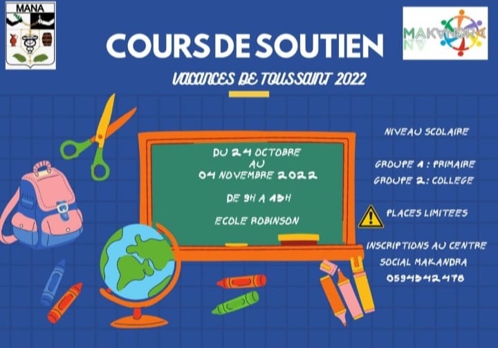 Le Centre Social MAKANDRA de Mana met en place des cours de soutien du lundi 24 octobre 2022 au vendredi 04 novembre 2022 de 9h00 à 13h00 à l’école ROBINSON.