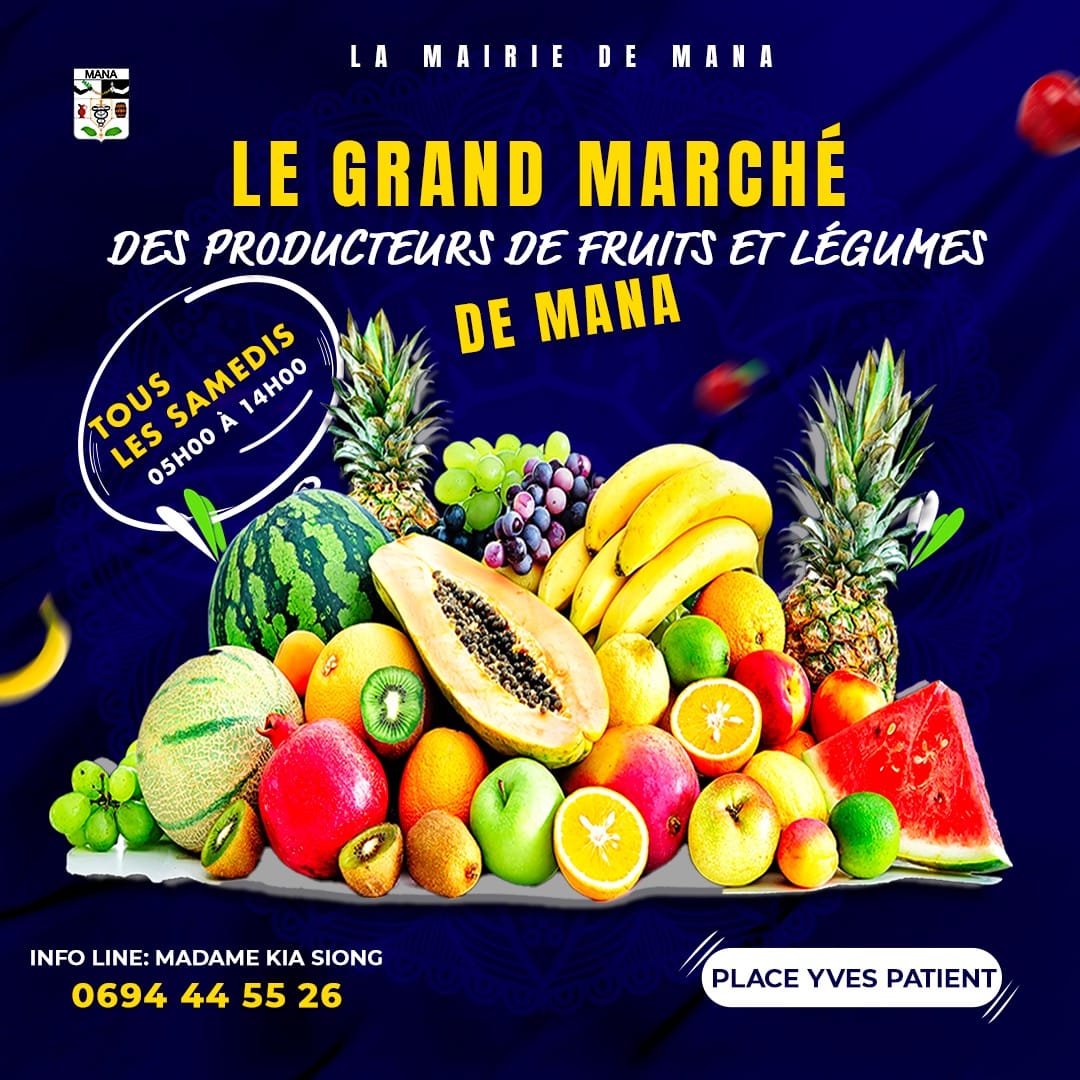 LA MAIRIE DE MANA VOUS INVITE AU GRAND MARCHÉ DES PRODUCTEURS DE FRUITS ET LÉGUMES LE SAMEDI 26 NOVEMBRE 2022 PLACE YVES PATIENT DE 5H À 14H DANS LE RESPECT DES GESTES BARRIÈRES.