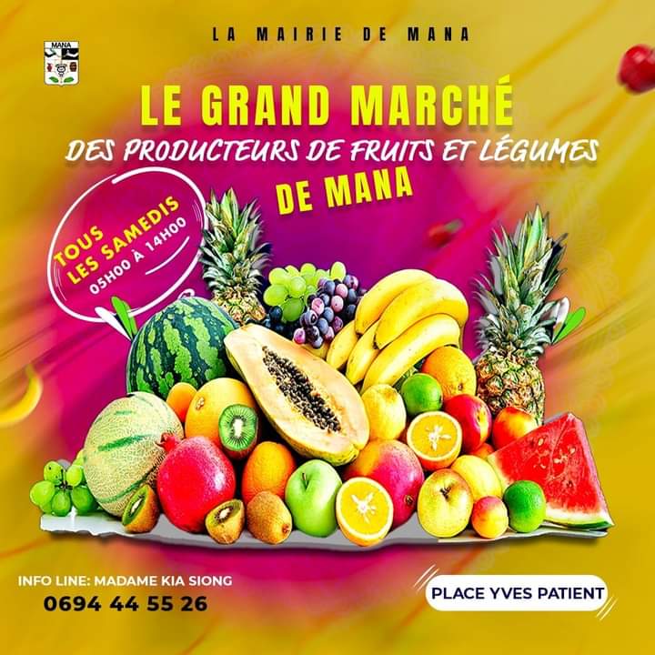 LA MAIRIE DE MANA VOUS INVITE AU GRAND MARCHÉ DES PRODUCTEURS DE FRUITS ET LÉGUMES LE SAMEDI 03 DÉCEMBRE 2022 PLACE YVES PATIENT DE 5H À 14H DANS LE RESPECT DES GESTES BARRIÈRES.