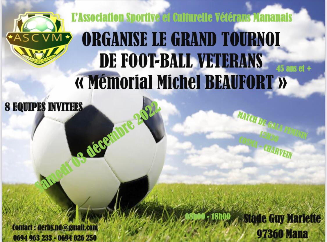 L’Association Sportive et Culturelle Vétérans Mananais organise le grand tournoi de football « Mémorial Michel BEAUFORT » le samedi 03 décembre 2022 de 08h00 à 18h00 au stade Guy MARIETTE.