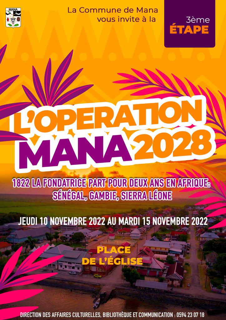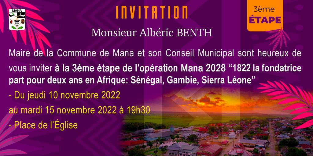 Le Maire de la Commune de Mana, M. Albéric BENTH et son Conseil Municipal sont heureux de vous inviter à la 3ème étape de l’opération Mana 2028 « 1822 la fondatrice part pour deux ans en Afrique : Sénégal, Gambie, Sierra Léone ».