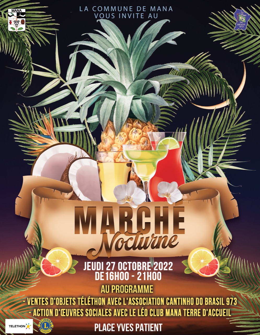 La Commune de Mana vous invite au marché nocturne du jeudi 27 octobre 2022 de 16h à 21h dans le respect des gestes barrières.