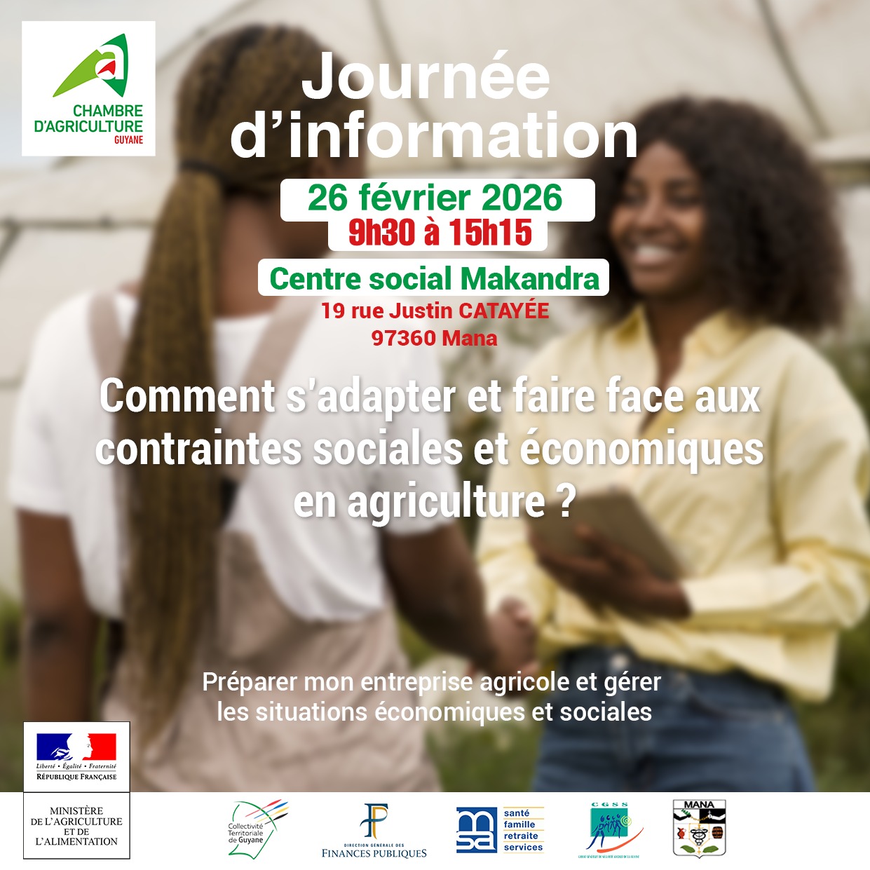 La Chambre d’Agriculture de Guyane, organise une Journée d’information, le jeudi 26 février 2026 de 9h30 à 15h15 au Centre Social Makandra.