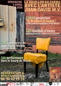Ce dimanche 5 avril 2026, jour de Pâques, on mange le bouillon d’awara avec les équipes du CARMA et l’artiste Juan David Molina (participation au repas 15 €), à partir de 11H.