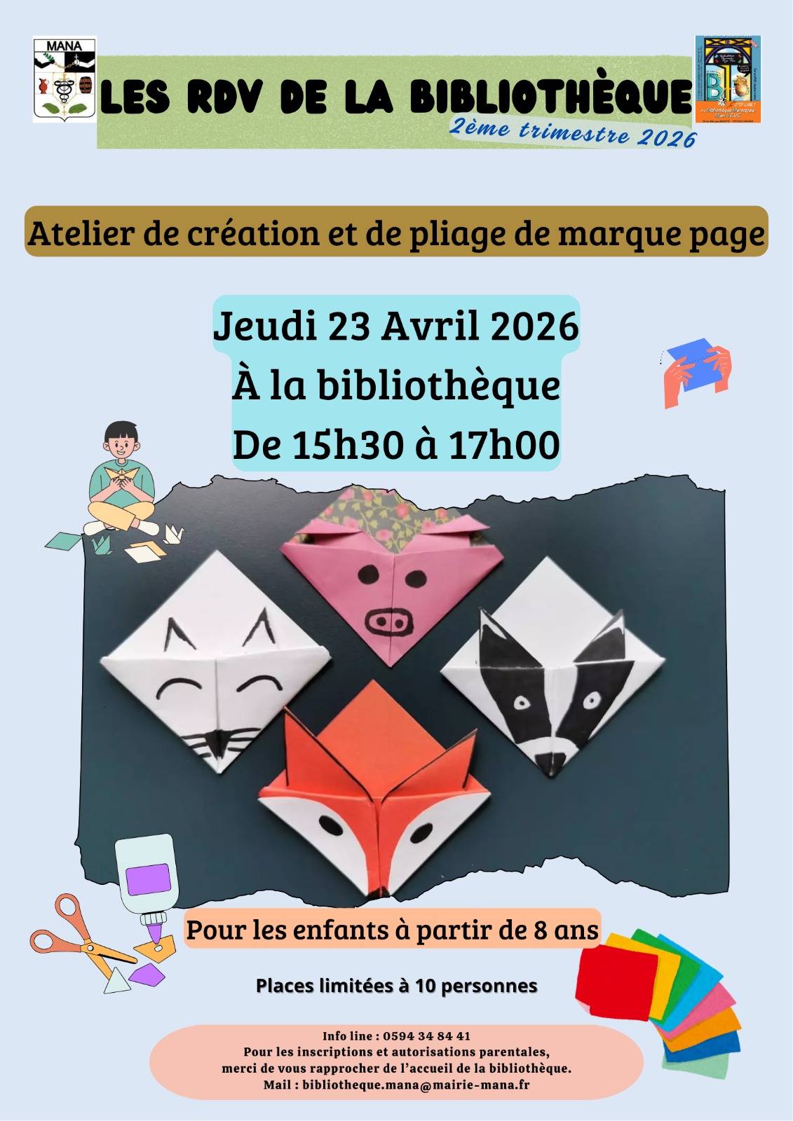 Les animateurs de la Bibliothèque Municipale Man Vévé organisent un atelier de création et de pliage de marque-pages, le jeudi 23 avril 2026, de 15h30 à 17h00.