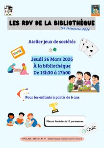 Les animateurs de la Bibliothèque Municipale Man Vévé organise un atelier jeux de sociétés, le jeudi 26 mars 2026 de 15h30 à 17h00.