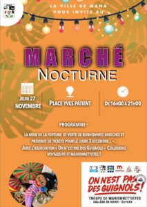 Le Maire de la Ville de Mana vous invite au Marché Nocturne du jeudi 27 novembre 2025 sur la places Yves PATIENT de 16h00 à 21h00.