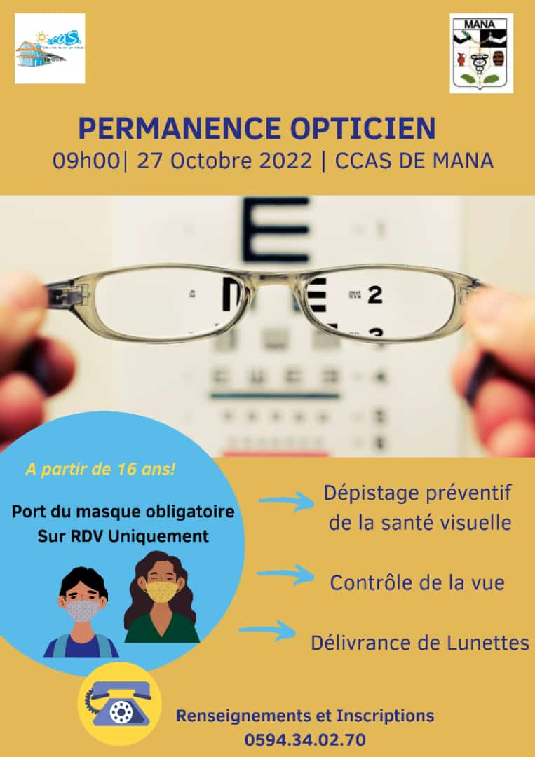 Permanence opticien ( à partir de 16 ans) le jeudi 27 octobre 2022 à 9h00 au CCAS de Mana.