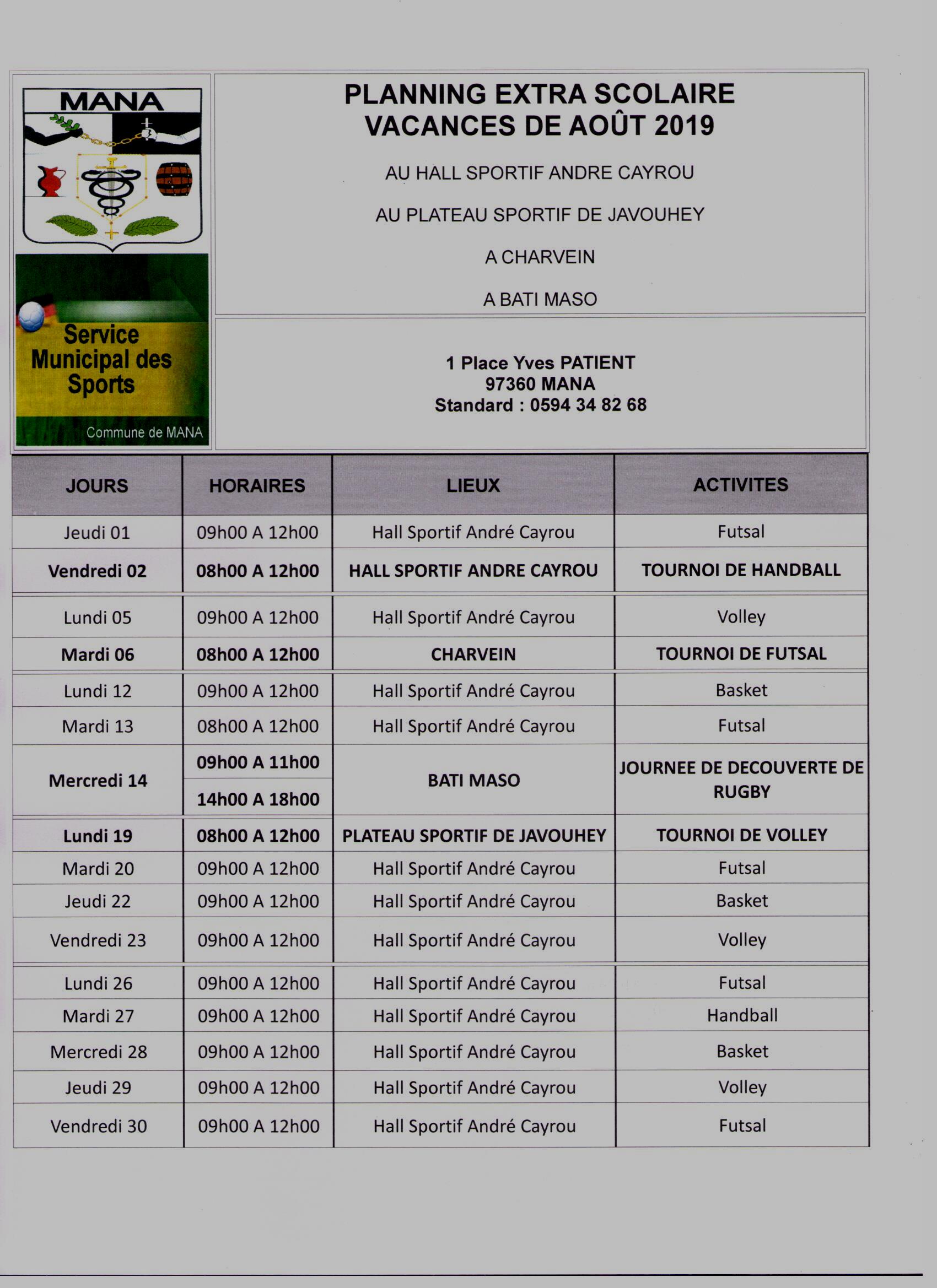 Plannings extra scolaire pour les vacances d’Août 2019