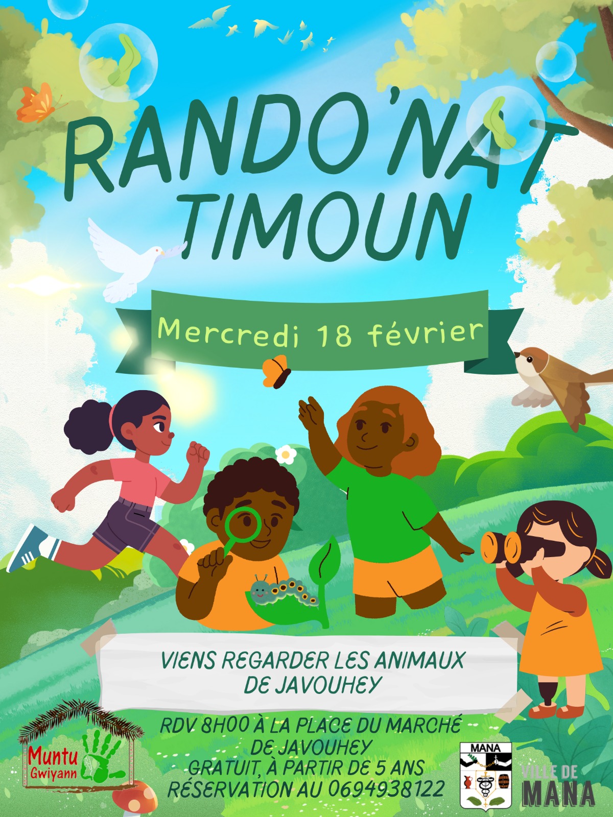 L’association Muntu Gwiyann organise une Rando’Nat Timoun, le mercredi 18 février 2026 à 8h00 à la place du marché de Javouhey.