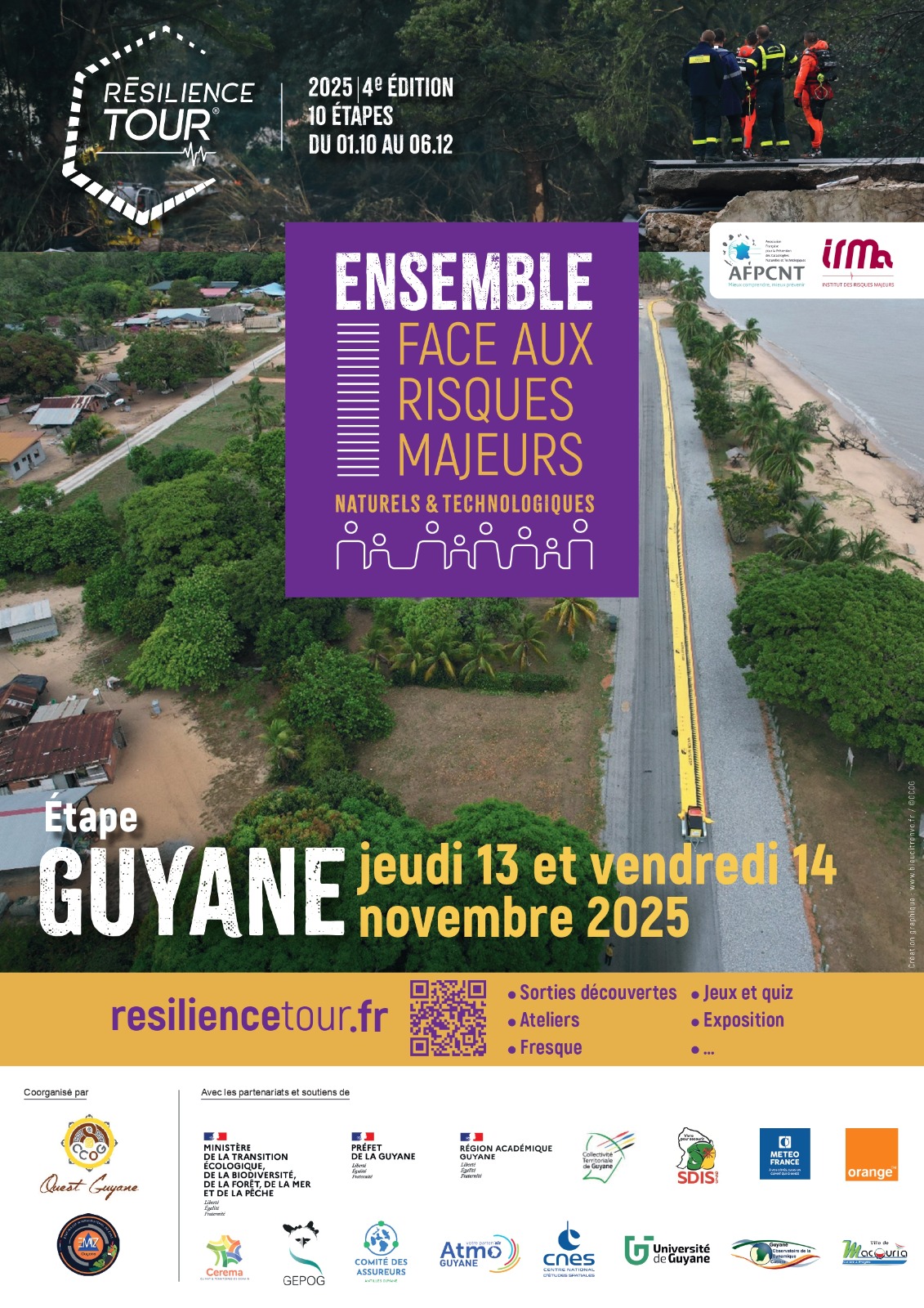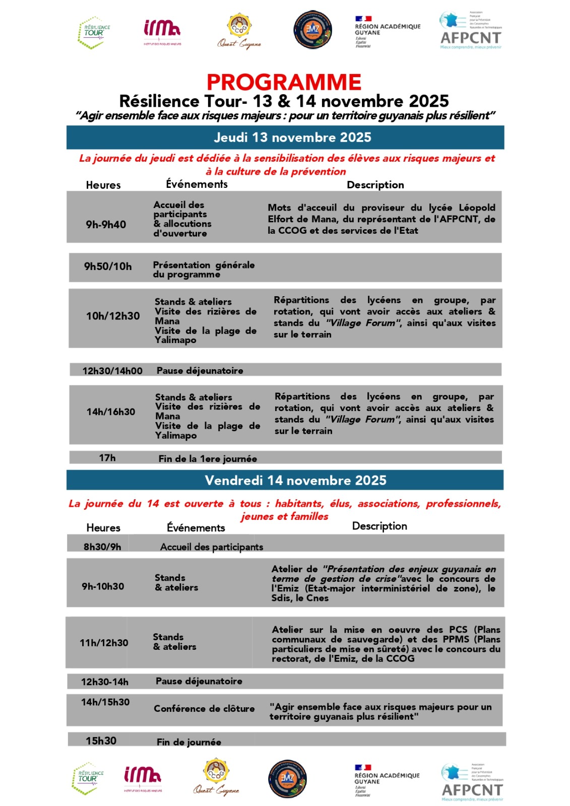 Dans le cadre du « Résilience Tour », la Mission Risques Majeurs de la Communauté de Communes de l’Ouest Guyanais (CCOG) a le plaisir de vous inviter à participer au « Village Forum » qui se tiendra ce jeudi 13 et vendredi 14 novembre 2025 au gymnase du lycée Léopold Elfort à Mana.