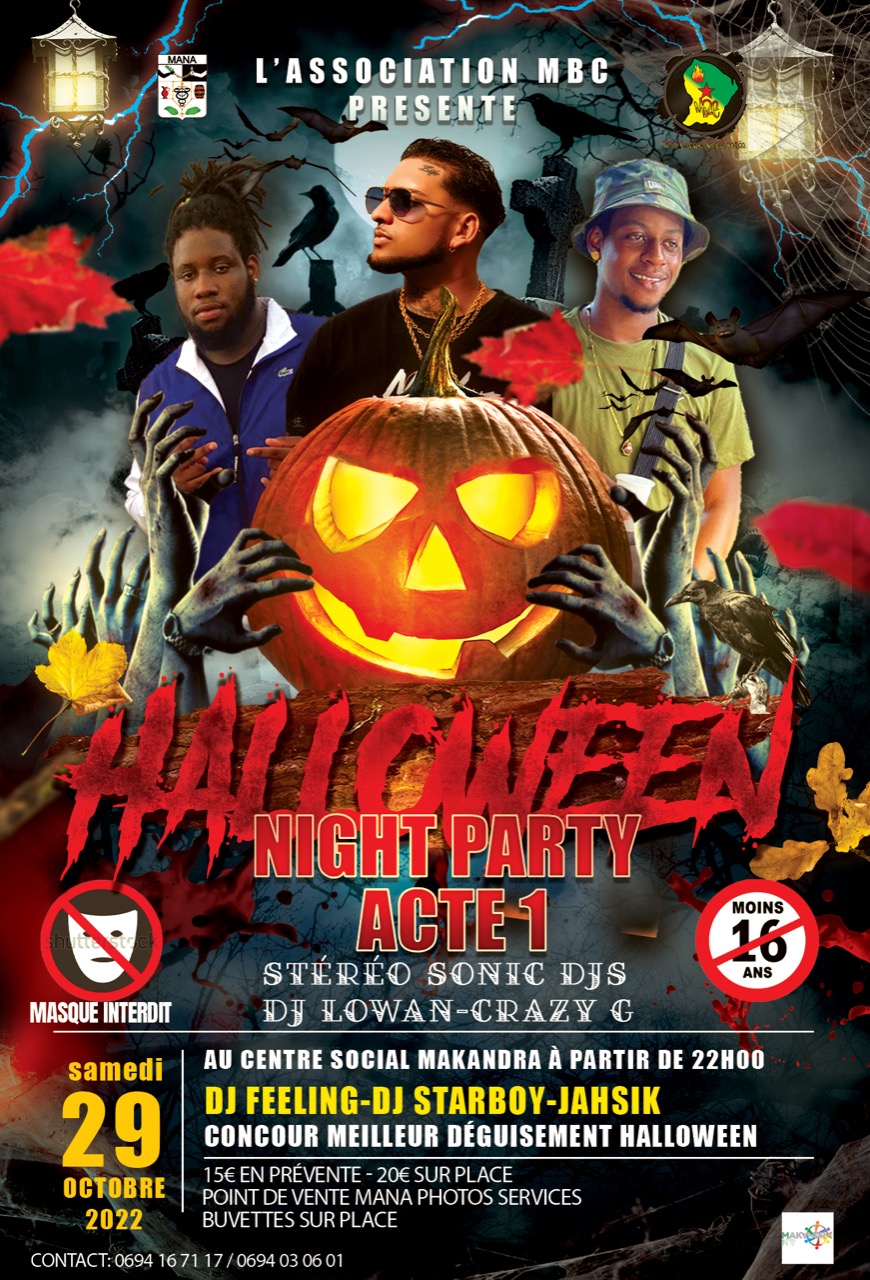 L’association MBC de Mana est heureuse de vous inviter à l’acte 1 de la soirée « HALLOWEEN NIGHT PARTY » qui se déroulera avec STEREO SONIC DJS – DJ LOWAN – CRAZY G, DJ STARBOY ainsi que l’artiste Guyanais JAHSIK.