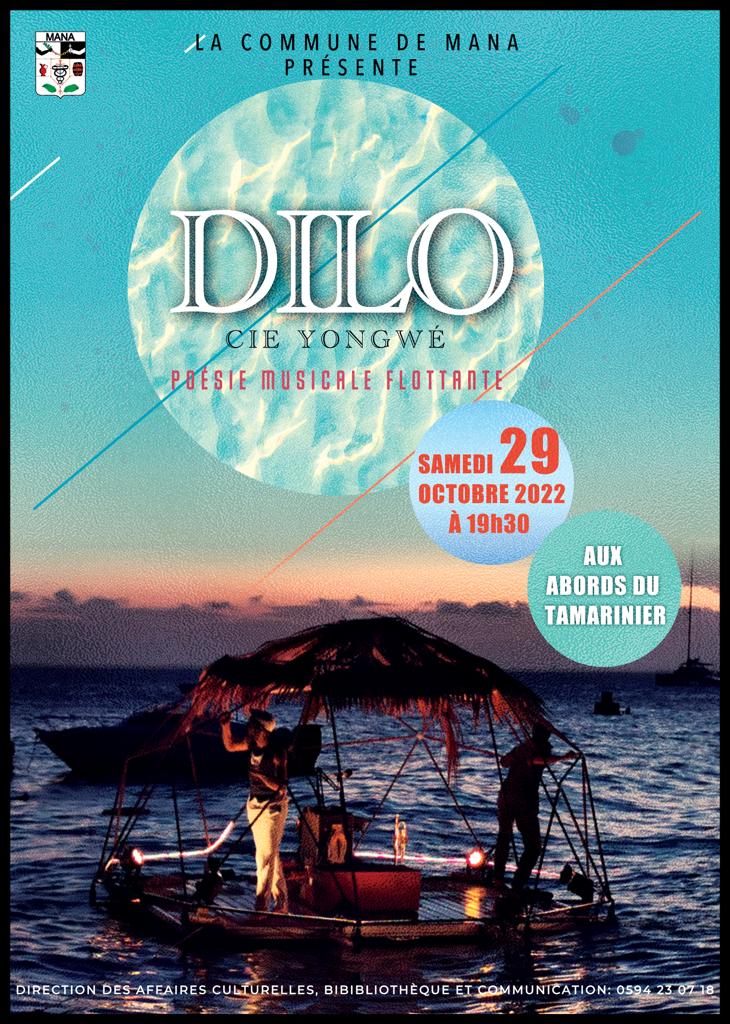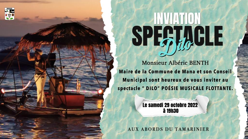 Le Maire de la Commune de Mana M. Albéric BENTH et son Conseil Municipal sont heureux de vous inviter au spectacle « Dilo » Poésie musicale flottante qui se déroulera le samedi 29 octobre 2022 à 19h30 aux abords du tamarinier.