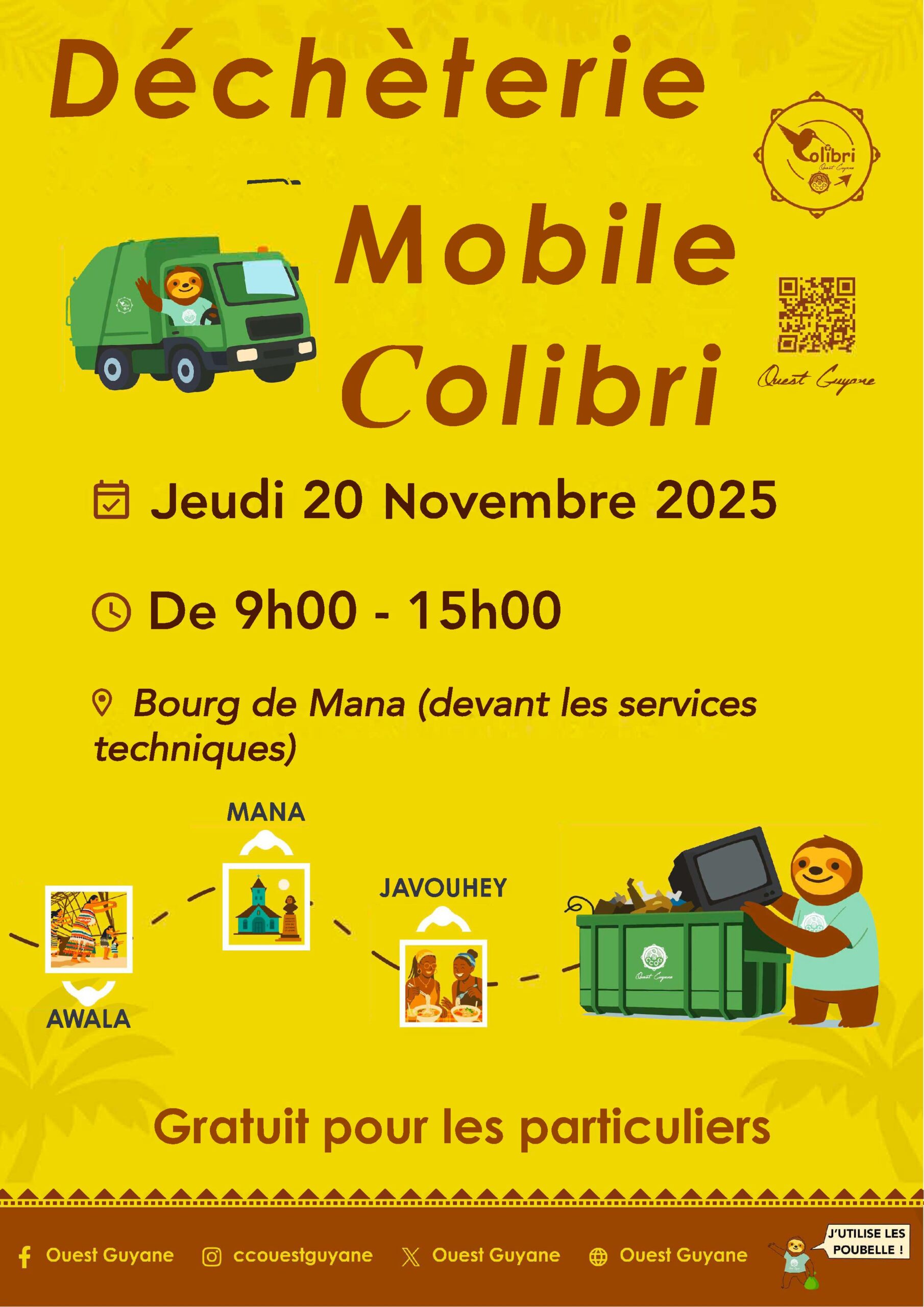 La Déchèterie Mobile Colibri au Bourg de Mana, le jeudi 20 novembre 2025 de 9h à 15h.